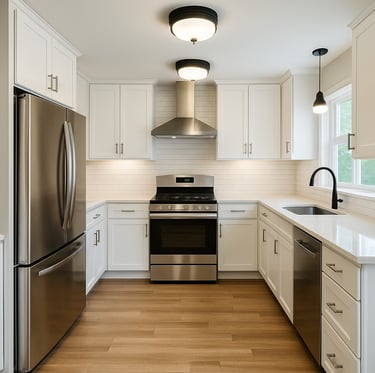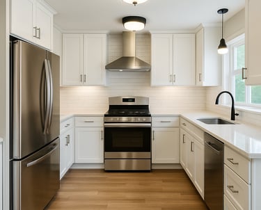 Cabinet refinishing, backsplash installation, new countertops, lighting, and functional improvements for a clean, updated kitchen look.