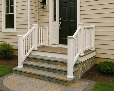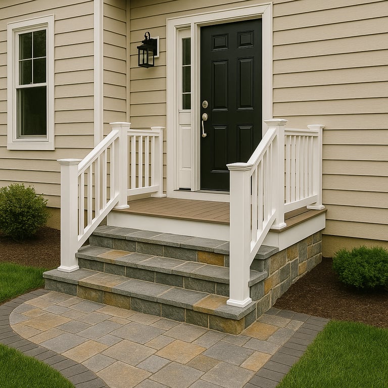 We specialize in transforming outdoor entryways with premium materials — from resurfacing concrete stairs with natural stone or tile to building new steps and porches with low-maintenance PVC decking. Every project is custom-fitted and precisely finished with secure railings, durable edging, and a clean, elegant look that lasts for years.